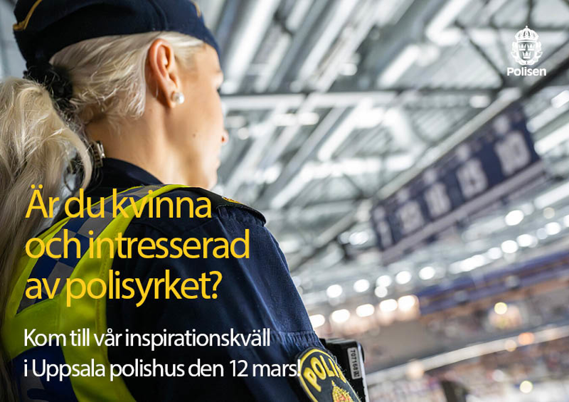 Polisområde Uppsala bjuder in till inspirationskväll för dig som är kvinna och intresserad av polisyrket. Under kvällen får du träffa kvinnor i olika polisfunktioner och höra deras personliga berättelser om sin väg till polisyrket och sina erfarenheter från arbetslivet. Du får också veta allt om hur du söker till polisutbildningen, ta del av träningstips inför de fysiska testerna och få svar på alla dina frågor.